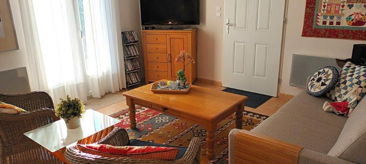 Ruime hoekbank, salontafel, servieskast, tv met o.a. Nederl. zenders en Belgie 1 en Canvas, DVD, Wifi internet, 6-persoonseethoek.