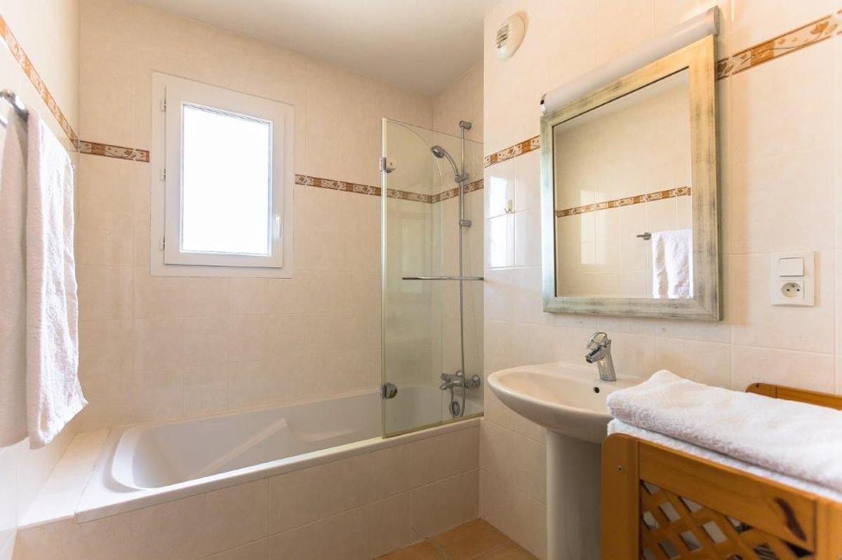 De villa heeft op de begane grond 2 slaapkamers en een badkamer met bad waarin een douche, wastafel, separaat toilet, hal met garderobe, royale moderne en luxe keuken,  bergkast; op de 1e verdieping via de trap in de hal, zijn nog eens 2 slaapkamers en de 2e badkamer met douche, wastafel en toilet en een prachtig overdekt inpandig terras met mooi uitzicht op de bergen. In 2023 zal de villa voorzien zijn van airco op de grote slaapkamer beneden en op de grote slaapkamer boven.