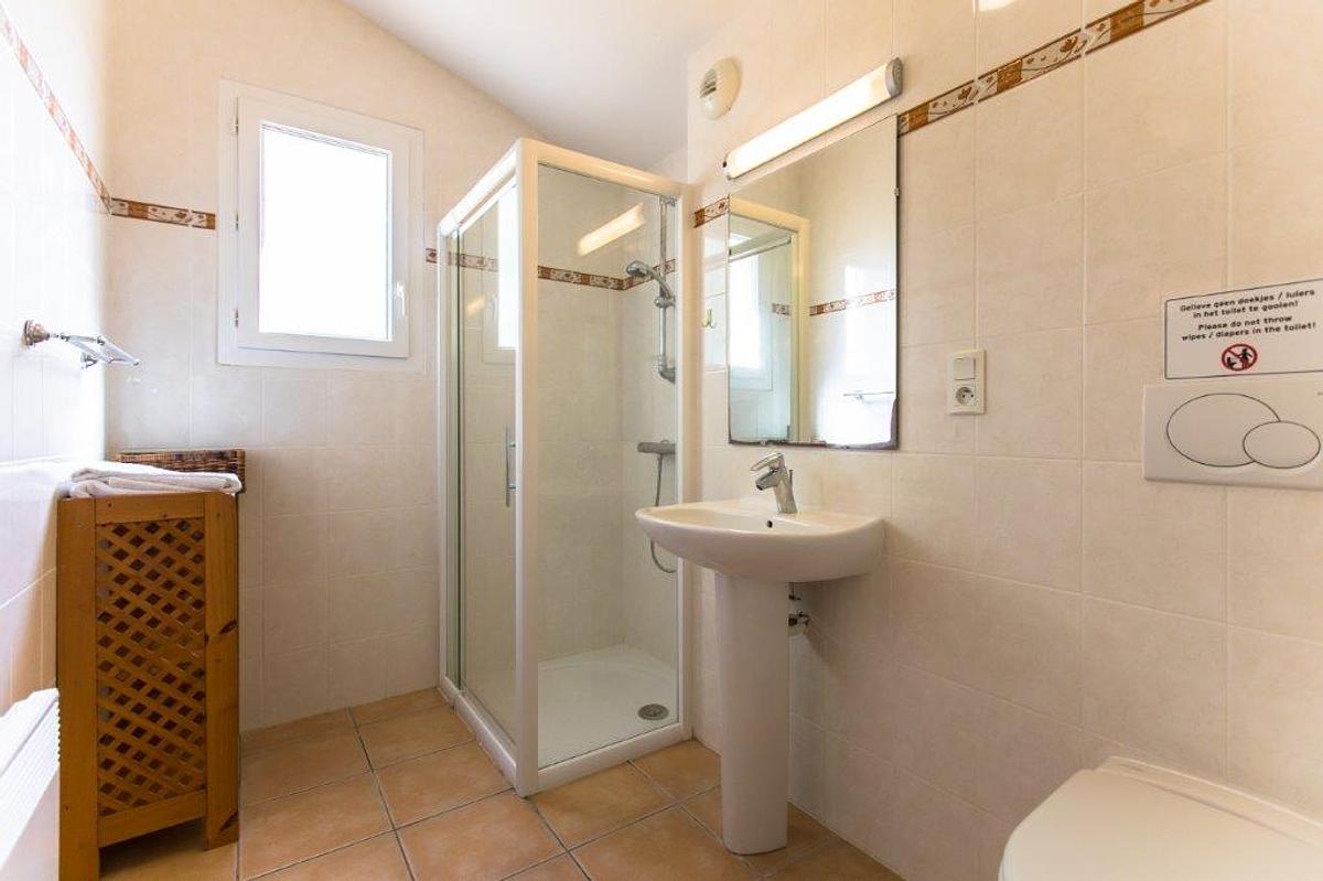 1e verdieping via de trap in de hal, vanuit de overloop toegang tot 2 slaapkamers (de grote slaapkamer is voorzien van airco) en er tussenin de 2e badkamer met douche, wastafel en toilet; vanuit de overloop deur met toegang naar een prachtig overdekt terras met fraai uitzicht.  Er is een plafondventilator en andere losse ventilatoren mocht het heel erg warm worden, maar u kunt overdag de houten luiken én de rolluiken sluiten.