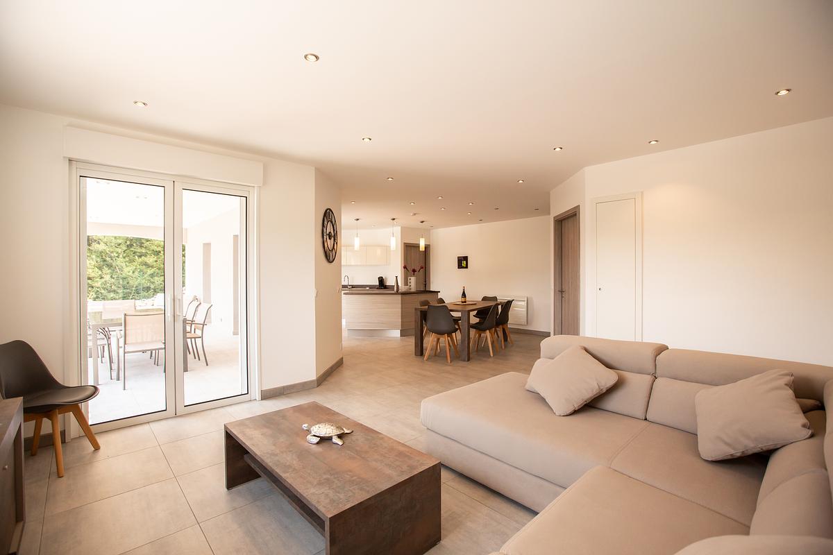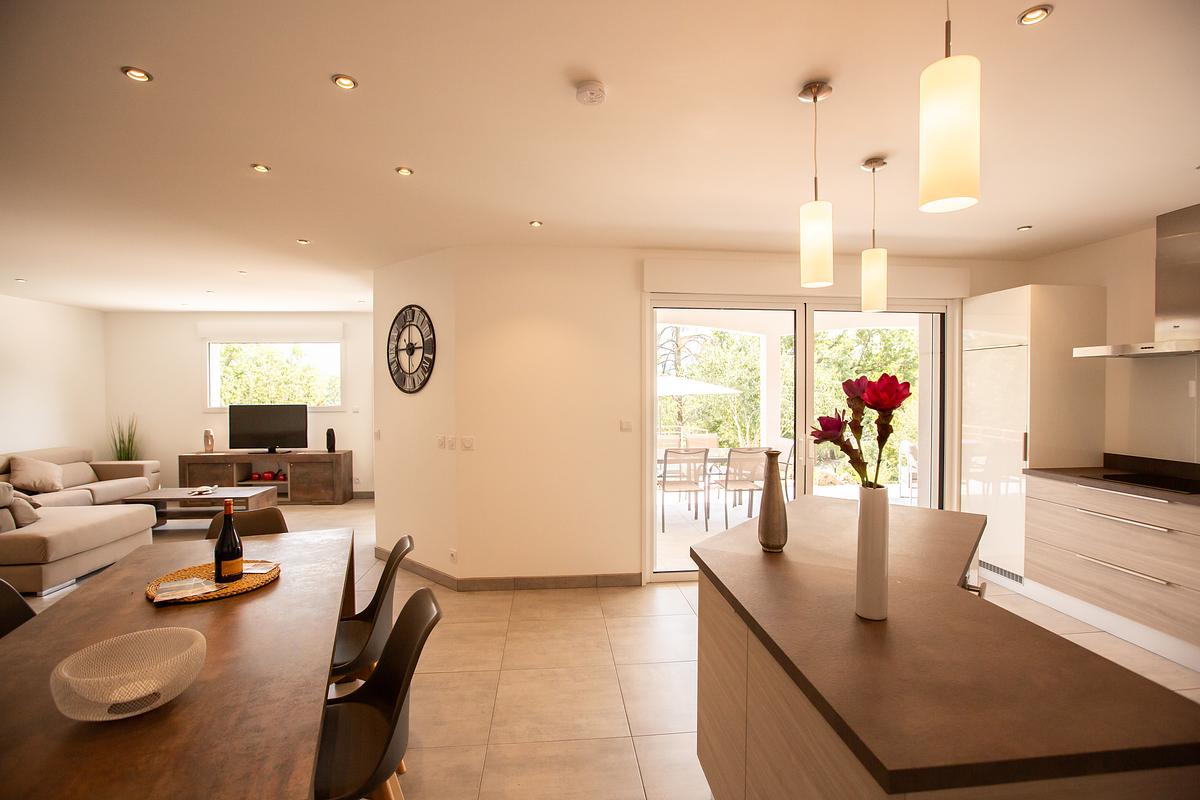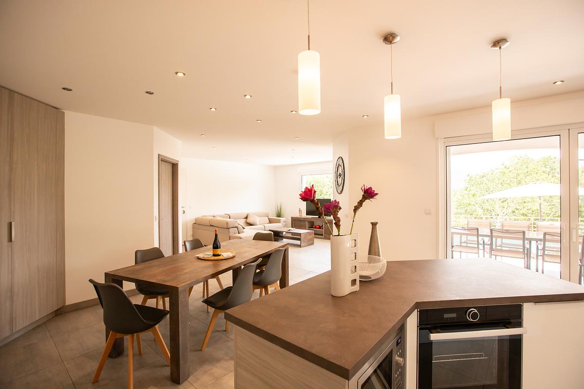 • 1 open keuken met kookeiland, verbonden met de eetkamer en het terras