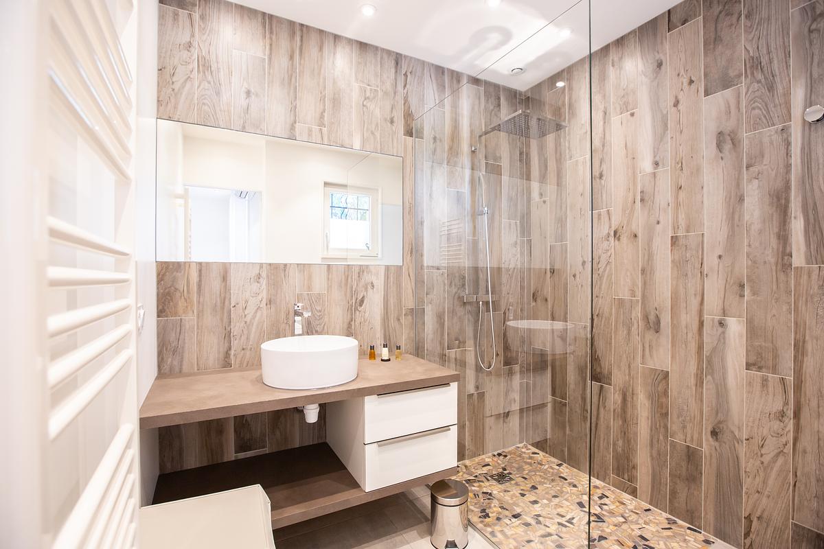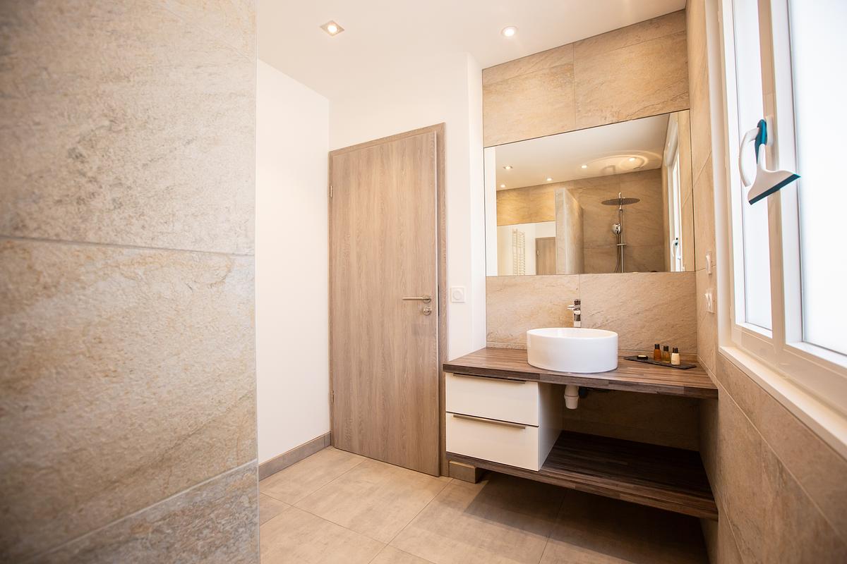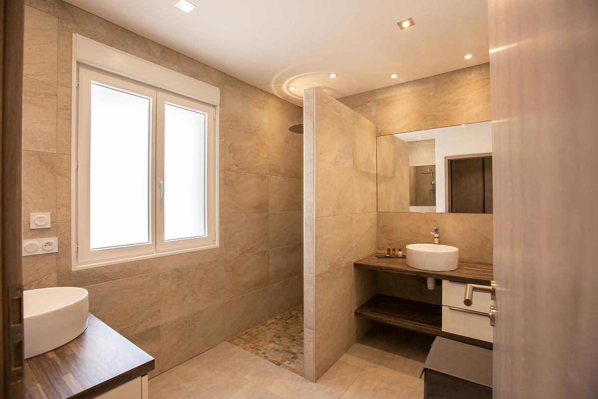 • 1 badkamer met douche, dubbele wastafel en handdoekdroger