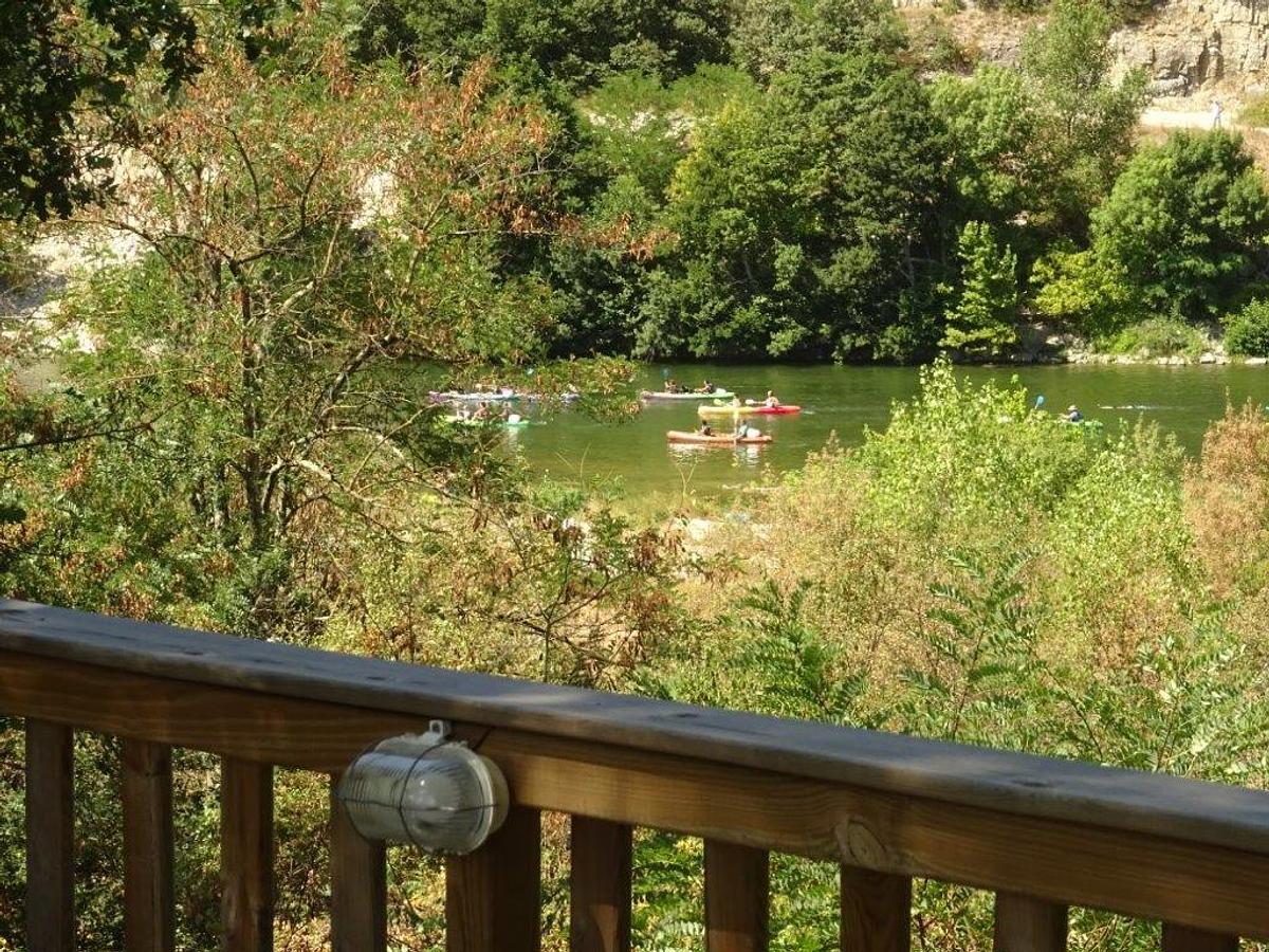 De vakantiewoning "Oleander" met verwarmd privé zwembad, airco op 4 slaapkamers én met vrij uitzicht op de oever en de rivier de Ardèche met voorbijtrekkende kano's via groot vlonder terras waarop loungeset en eetset.